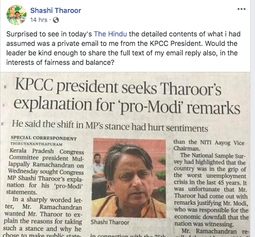 മോദിയെ എതിർക്കരുത് എന്നല്ല നയങ്ങളെ എതിർക്കണം… വ്യക്തിയല്ല നയങ്ങളാണ് ചർച്ചാ വിഷയം എന്ന്… വ്യക്തികളുടെ ചർച്ചയിൽ കാര്യങ്ങളും കാര്യപ്രാപ്തിയും കാണാതെ പോകരുത് എന്ന്… എതിർപ്പ് ദുര്ബ്ബലമാവരുത് എന്ന്…. constructive criticism വേണമെന്നാണ് പറഞ്ഞത് അല്ലെ….? അത് വഴി കോൺഗ്രസ്സ് എന്ന പാർട്ടിയുടെ credibility കൂടുകയേ ഉള്ളു എന്നാണ് മൂപ്പര് പറയുന്നത്… അല്ലെ…?