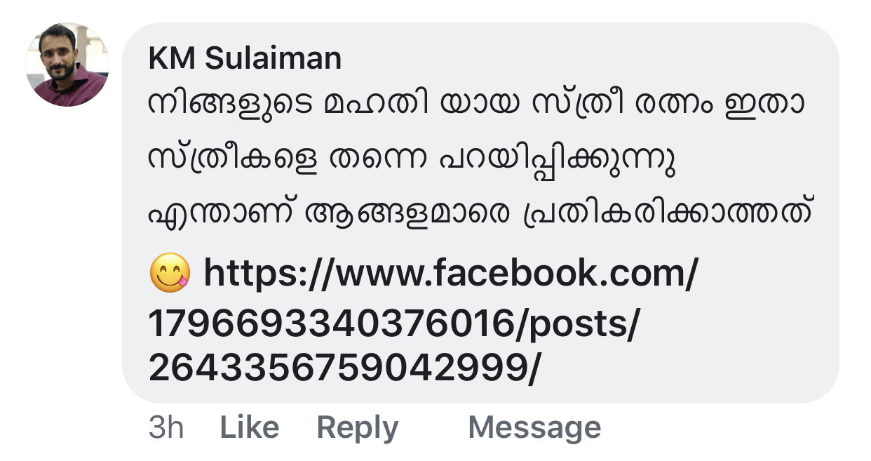 പിന്നെ സ്ത്രീകൾ നിങ്ങൾ ചില ആണുങ്ങളുടെ മാനസിക വൈകല്യത്തിൽ നിന്നും രക്ഷ നേടാൻ നിങ്ങൾ പറയുന്ന രീതിയിൽ വസ്ത്രം ധരിക്കുകയും പെരുമാറുകയും മിണ്ടാതിരിക്കുകയും ചെയ്യണമെന്ന ആവശ്യവുമായി ആരെങ്കിലും വരുകയാണെങ്കിൽ മനസിലാക്കുക ചില ആണുങ്ങളുടെ മാനസിക വൈകല്യം പേടിച്ച് പെണ്ണുങ്ങളെ മൂടി കെട്ടിയും ചങ്ങലക്കിട്ടും വളർത്താൻ കഴിയില്ല…. അതല്ല പ്രതിവിധി…. പിന്നെ അങ്ങനെ മാനസിക വൈകല്യമുള്ള ആണുങ്ങളുടെ വക്കാലത്ത് ഇവിടെ എടുക്കാറില്ല….